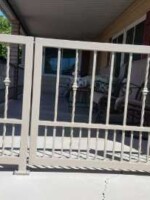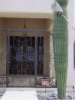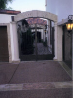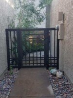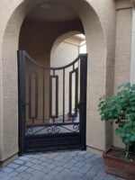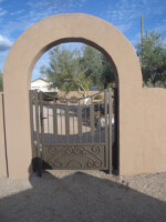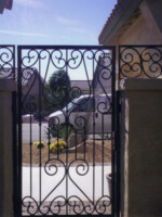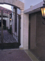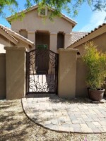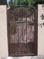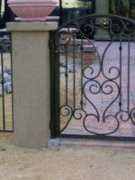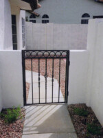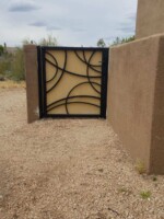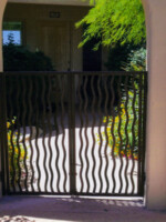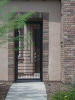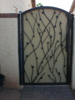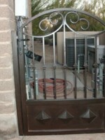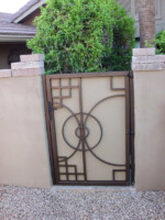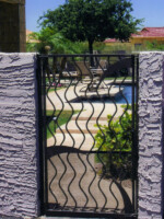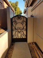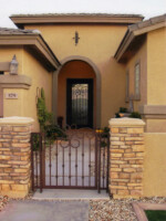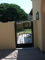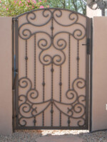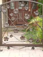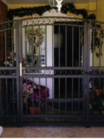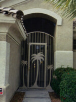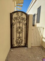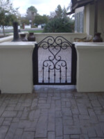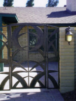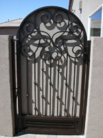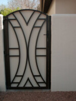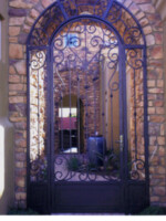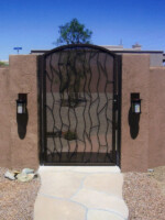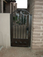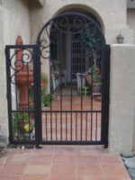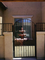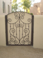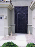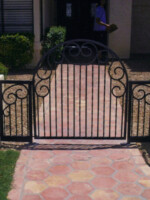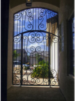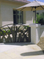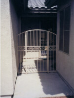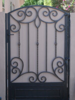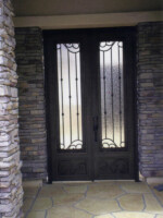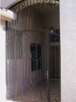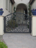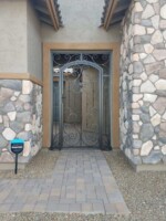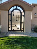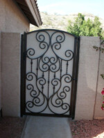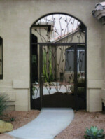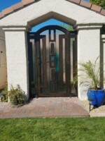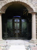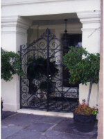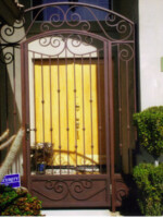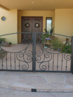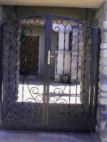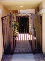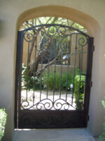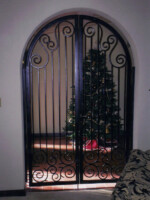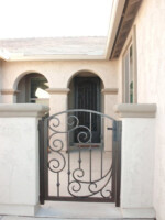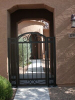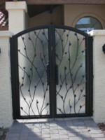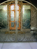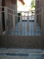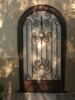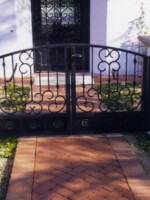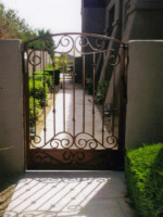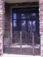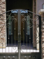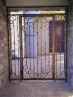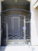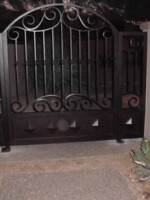 Our decorative doors and gates have fixed panels used to close in a back yard, courtyard, patio area, or entry to the home. These doors or gates do not receive wood and can be made in a single or double door or gate with side fixed panels. Double doors and gates can be made to receive two cane bolts or flush bolts that lock the door at the bottom to add security. Side panels to match the gate are used with the gate to enclose the entryway of the home. All gates are built with a 1″ to 2″ inch-mitered frame with posts connected with heavy-duty adjustable hinges. The hinges are designed to adjust if there is any movement in the wall. All doors come standard with a frieze, locks, and levers.